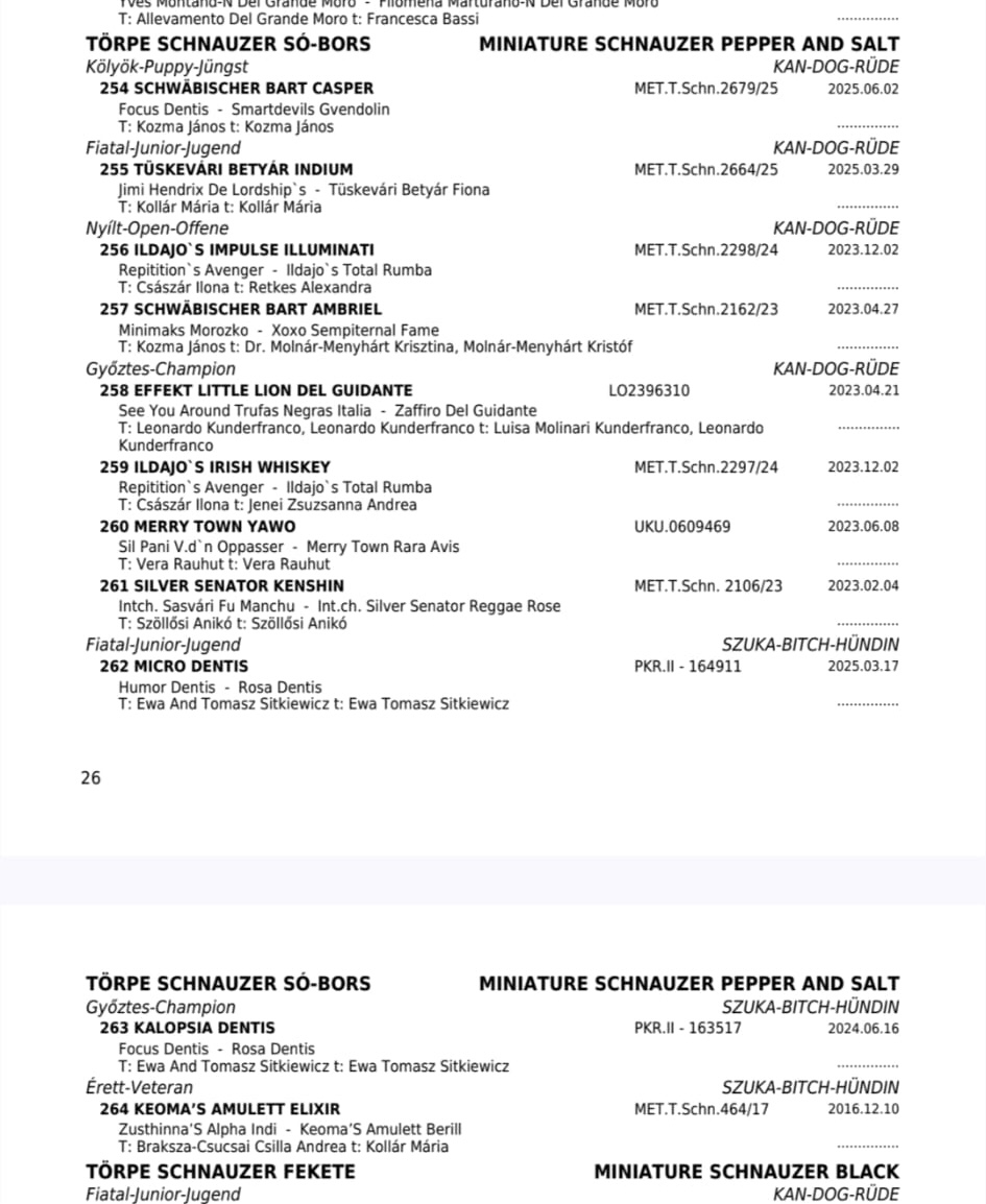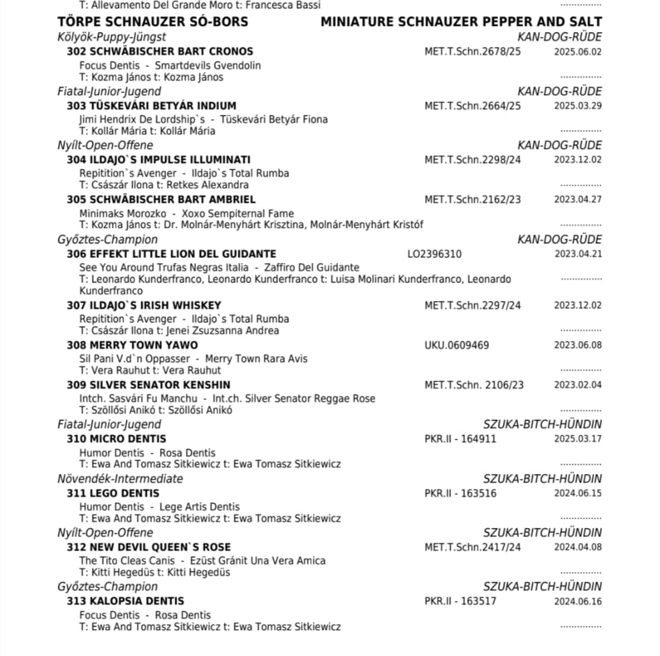 KALOPSIA Dentis- kl.championów- ocena doskonała (exc.), lokata 1. (V1), wniosek do tytułu Championa Węgier (CAC), rezerwowy wniosek do tytułu Międzynarodowego Championa Piękności (ResCACIB)